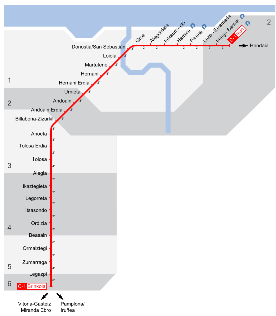 Zumarragara Irun, Gasteiz, Miranda de Ebro, Madril eta Bartzelonako lineak eta gero aldiriko C1 Irun-Brinkola Legazpira.